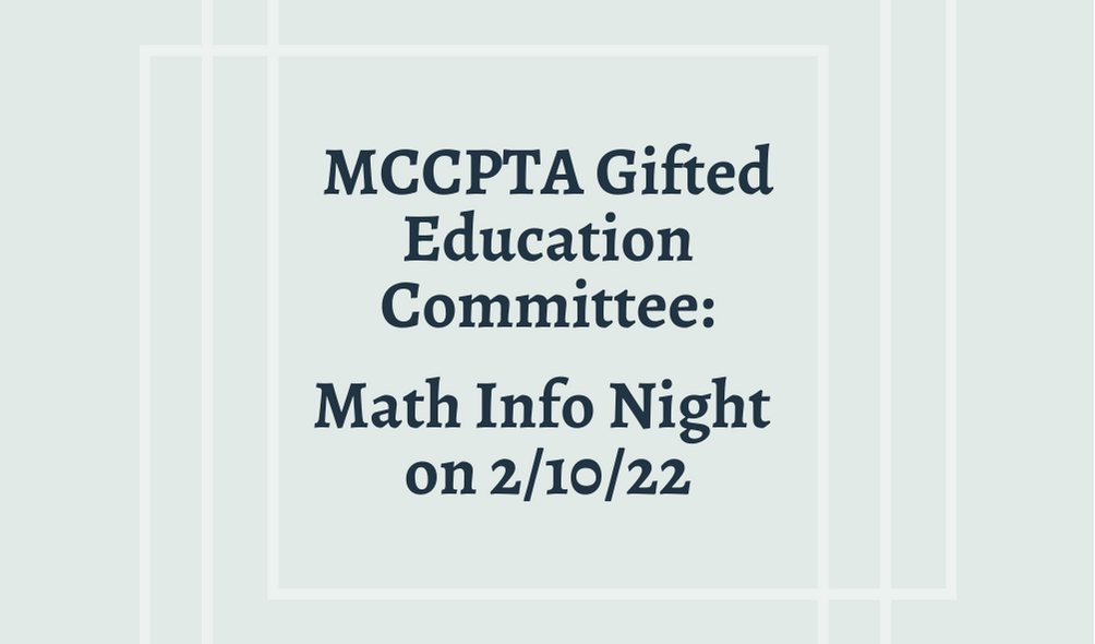 The MCCPTA Gifted Education Committee invites MCPS parents and caregivers to a "Mathematics Information Night” on Thursday, February 10th @ 7pm.
